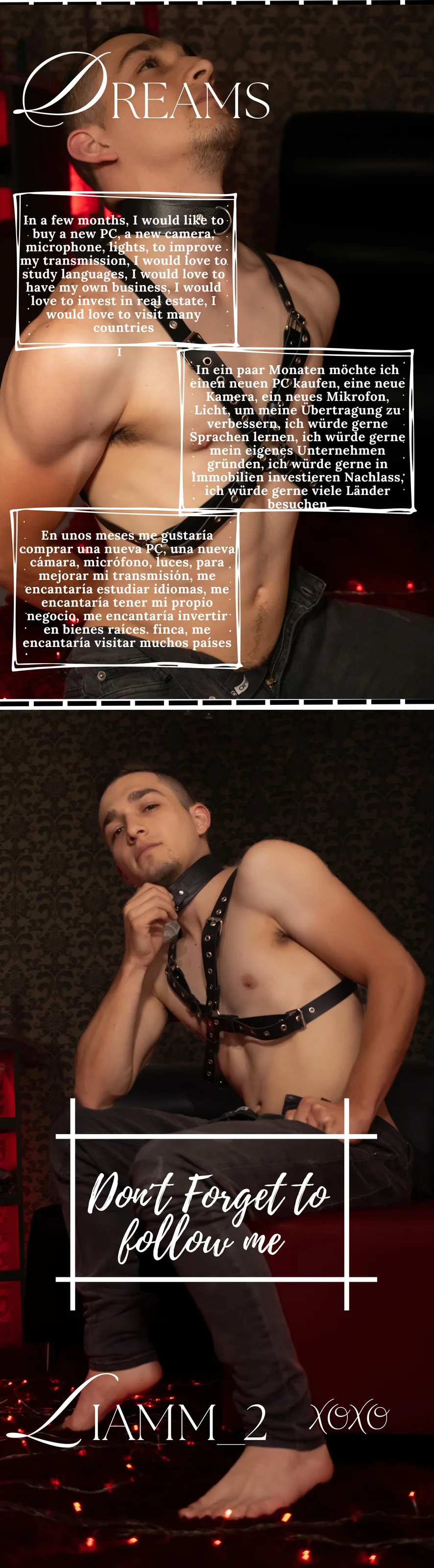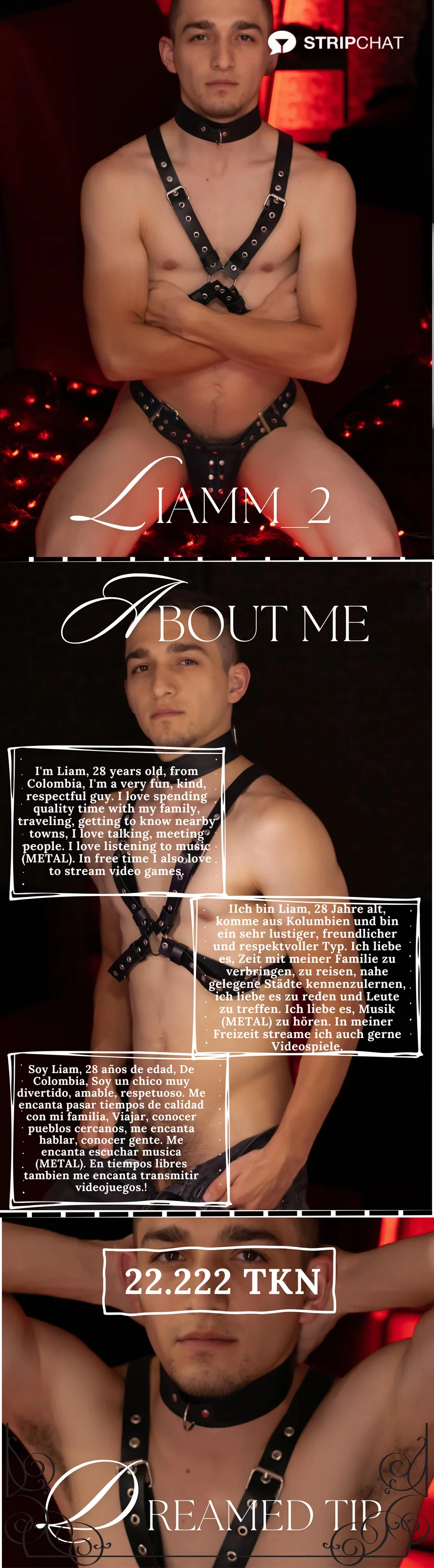 Soy Liam, tengo 29 años de edad, Soy de Colombia, soy un chico muy divertido, amable, respetuoso. Me encanta pasar tiempos de calidad con mi familia, viajar, conocer pueblos cercanos, me encanta hablar, conocer personas. Me encanta escuchar música (METAL). En tiempos libres también me encanta transmitir videojuegos.