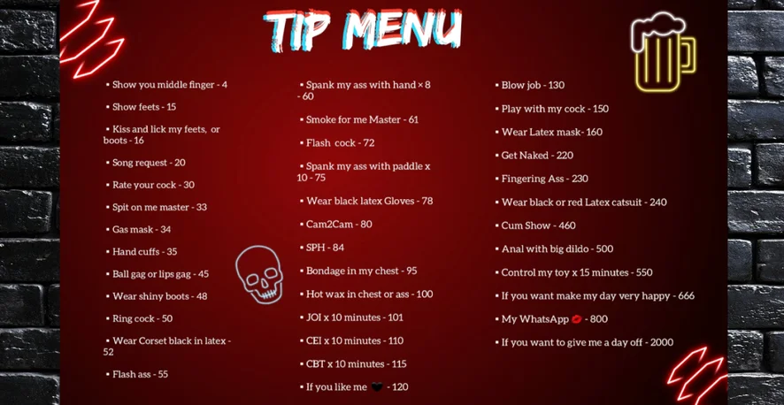 Fessée, Fumeurs, Masturbation, Cuir, Fétichisme des pieds, Pompe à pénis, CEI, Dirty Talk, Anneau de bite, Gode ou vibromasseur, Éjaculation, Humiliation, Gagging, Sexe anal, Sextoys anaux, Sextoys, Accessoires pour tétons, Fellation, Orgasme, Gang-Bang, SPH
